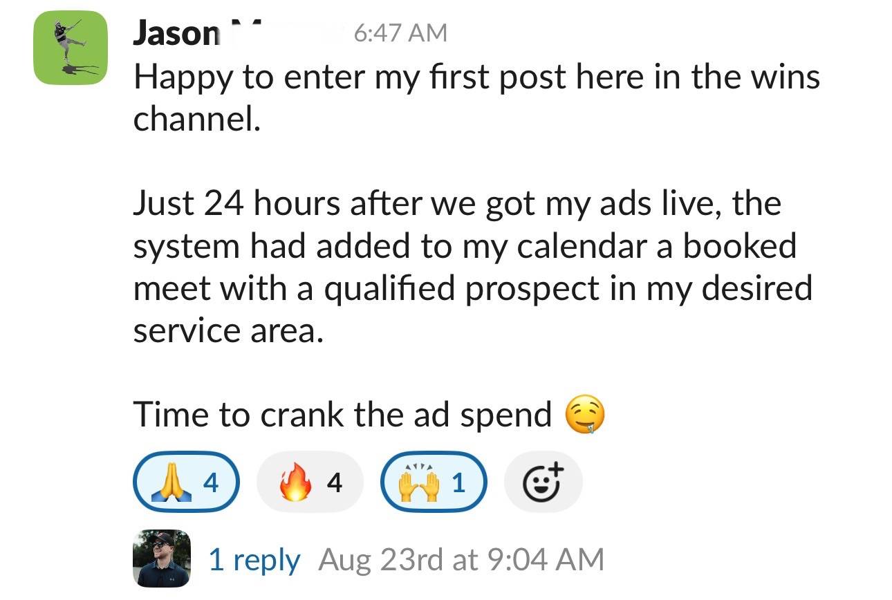 Jason had just launched his ads. Literally 24 hours later… No chasing. Just a system doing its job. “The system booked a meeting with a qualified lead in my ideal service area. Time to crank the ad spend 😏” When you have: ✅ A niche-specific offer …leads don’t trickle in — they show up ready to buy. This is what we build for our clients every single week. If you’re tired of inconsistent leads or spending your time chasing down the wrong ones… Let us build the system for you — and get those calls rolling in. → Book a free strategy call here Let’s turn your calendar into a client-generating machine. |