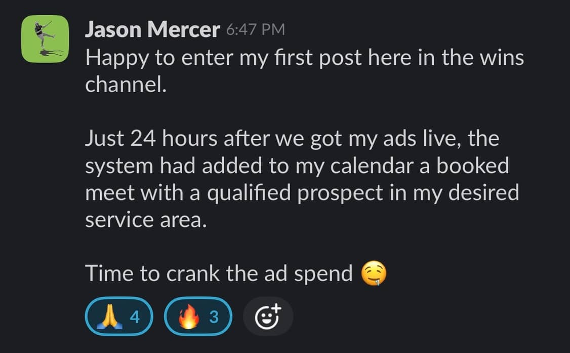Jason had never posted in the wins channel before. But once we flipped on his ads, that changed quick: "Just 24 hours after we got my ads live, the system added a booked meeting with a qualified prospect in my ideal niche.” One day. One system. One qualified lead on the calendar — without doing any cold outreach, follow-ups, or guesswork. That’s what happens when you stop relying on referrals… 💡 We helped him define his offer No chasing. Now he’s ready to crank the ad spend — because it’s working. Want that same system running for you? Let’s get your first booked call — in 24 hours or less. |